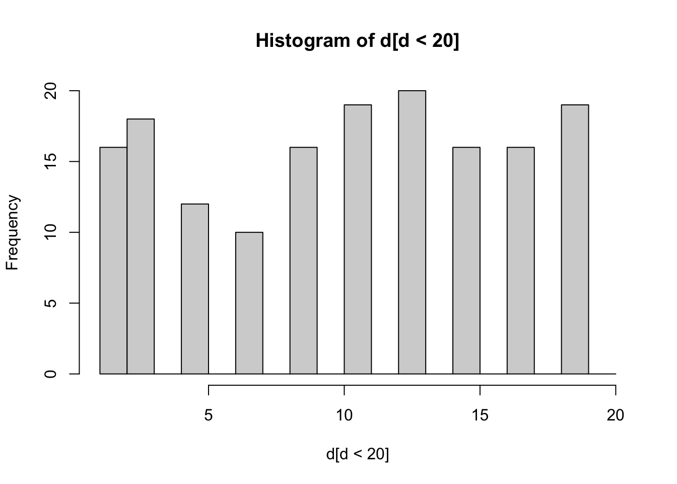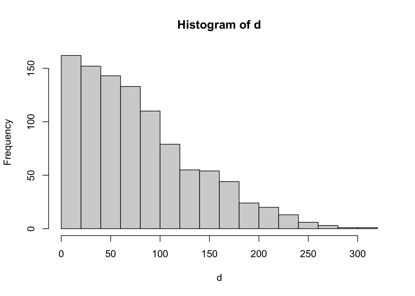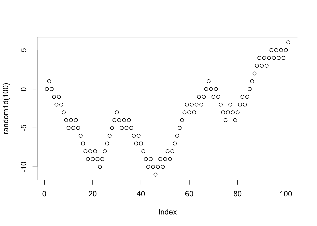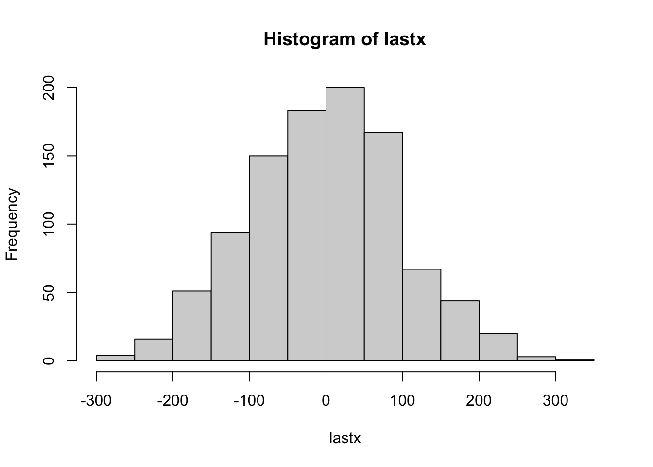 tmax<-10000lastx<-0for (i in1:1000){ x<-random1d(tmax) lastx[i]<-x[tmax]}hist(lastx)