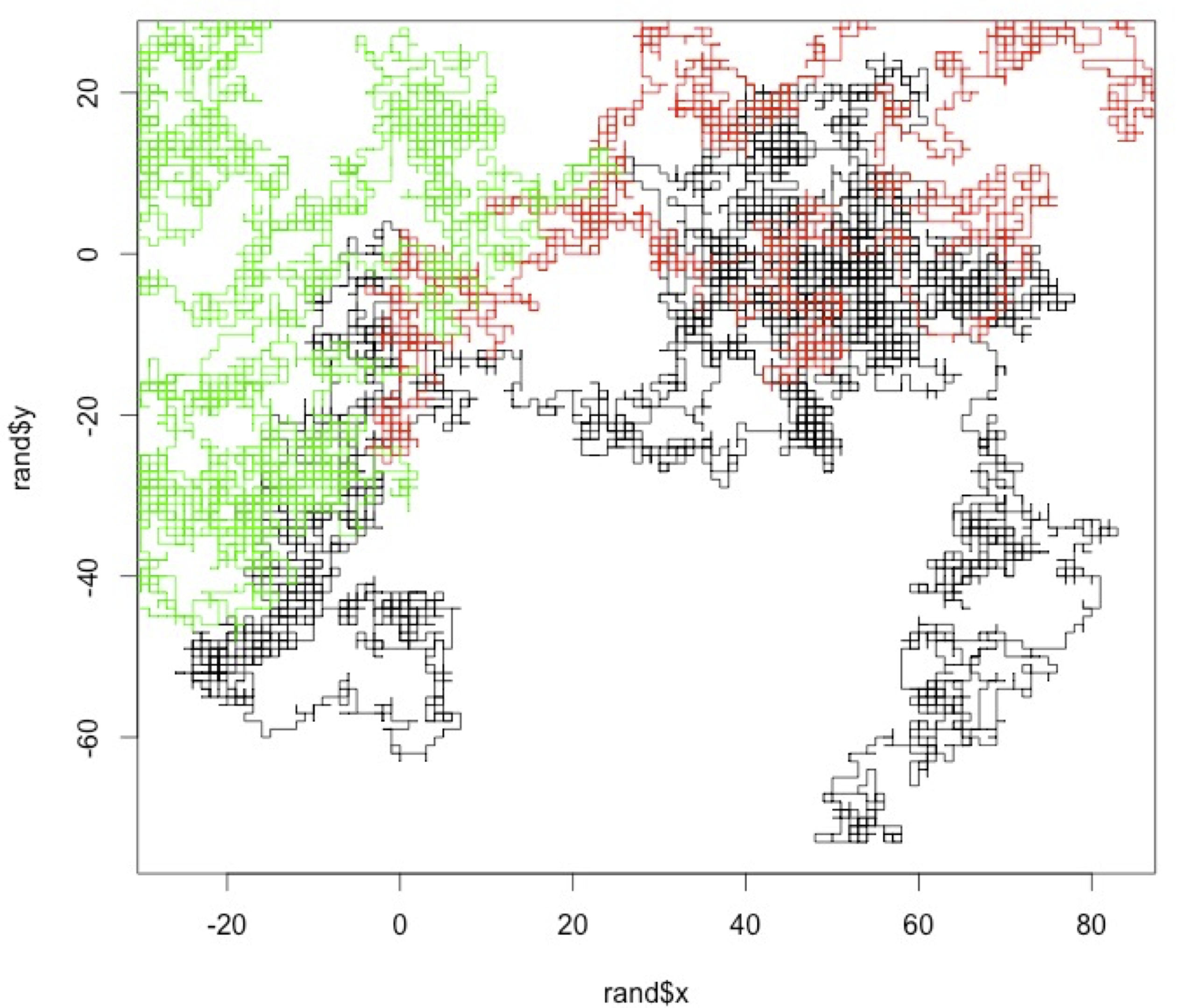 - Plot together the random walks (at least 5000 steps) of a few individuals.