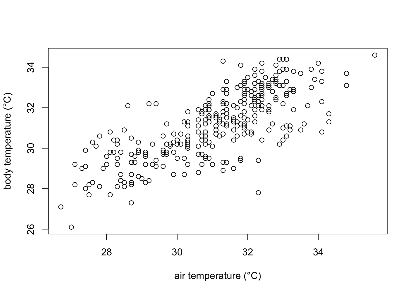 plot(df$ambient.temp.C, df$bodytemp.C,