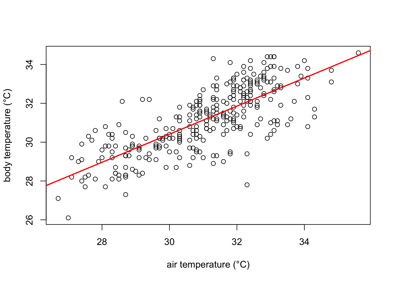 In the plot we can observe that indeed body temperature increases with increasing temperature. However, we cannot quantitatively know how much is this increase. For that, we can model how air temperature affects body temperature modelling them a a line with the equation:
