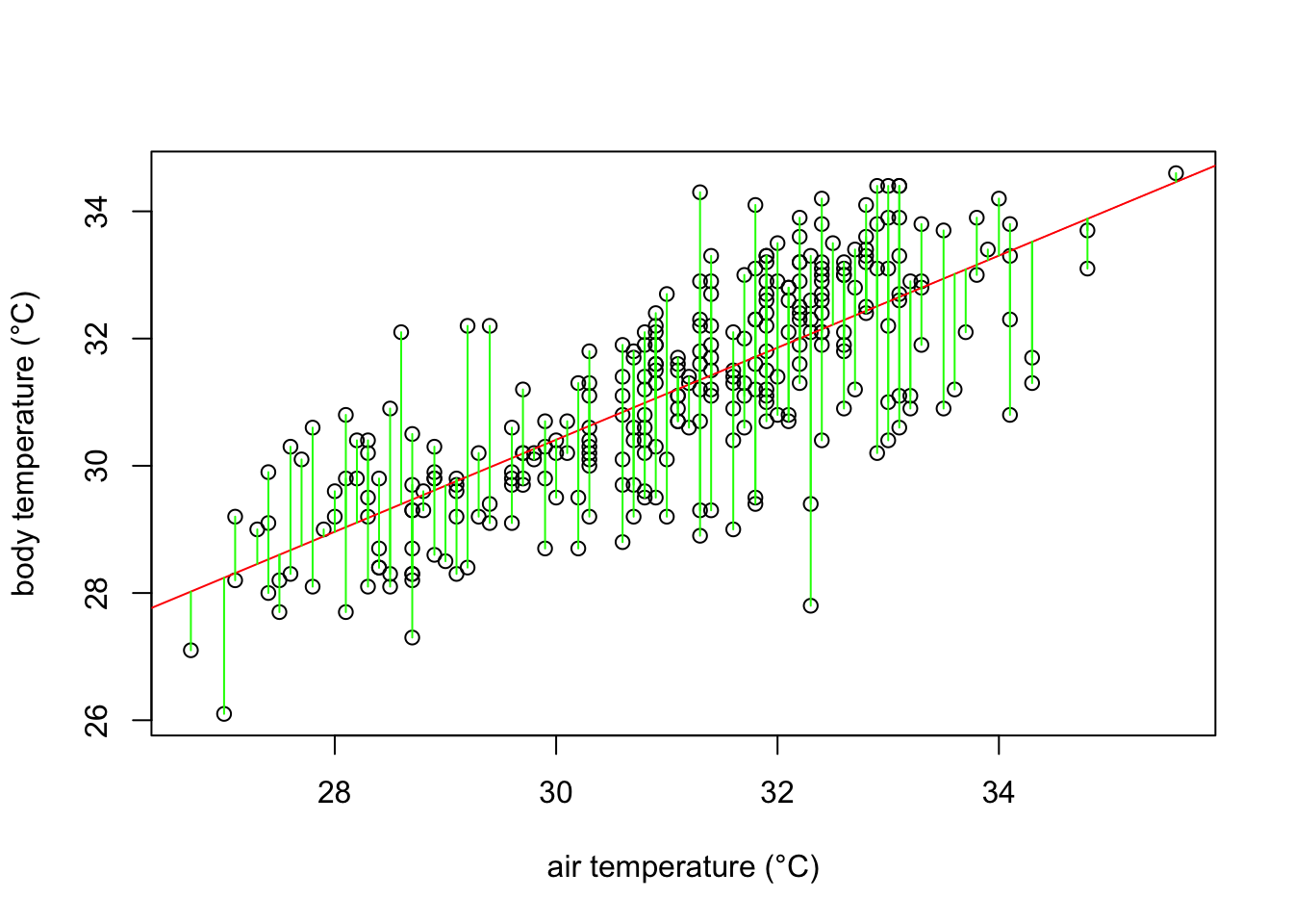The red line in the plot follows very well the pattern of increase shown by our data. It is noticeable, however, that some points fall farther from the line of best fit than others. In other words, many \(\hat{y}\) values (body temperature) are predicted with larger errors than others, for a given \(x\) value (ambient temperature). These errors are also known as residuals, and are the vertical distance between the observed values and the line of best fit. They are graphically represented in green in our plot: