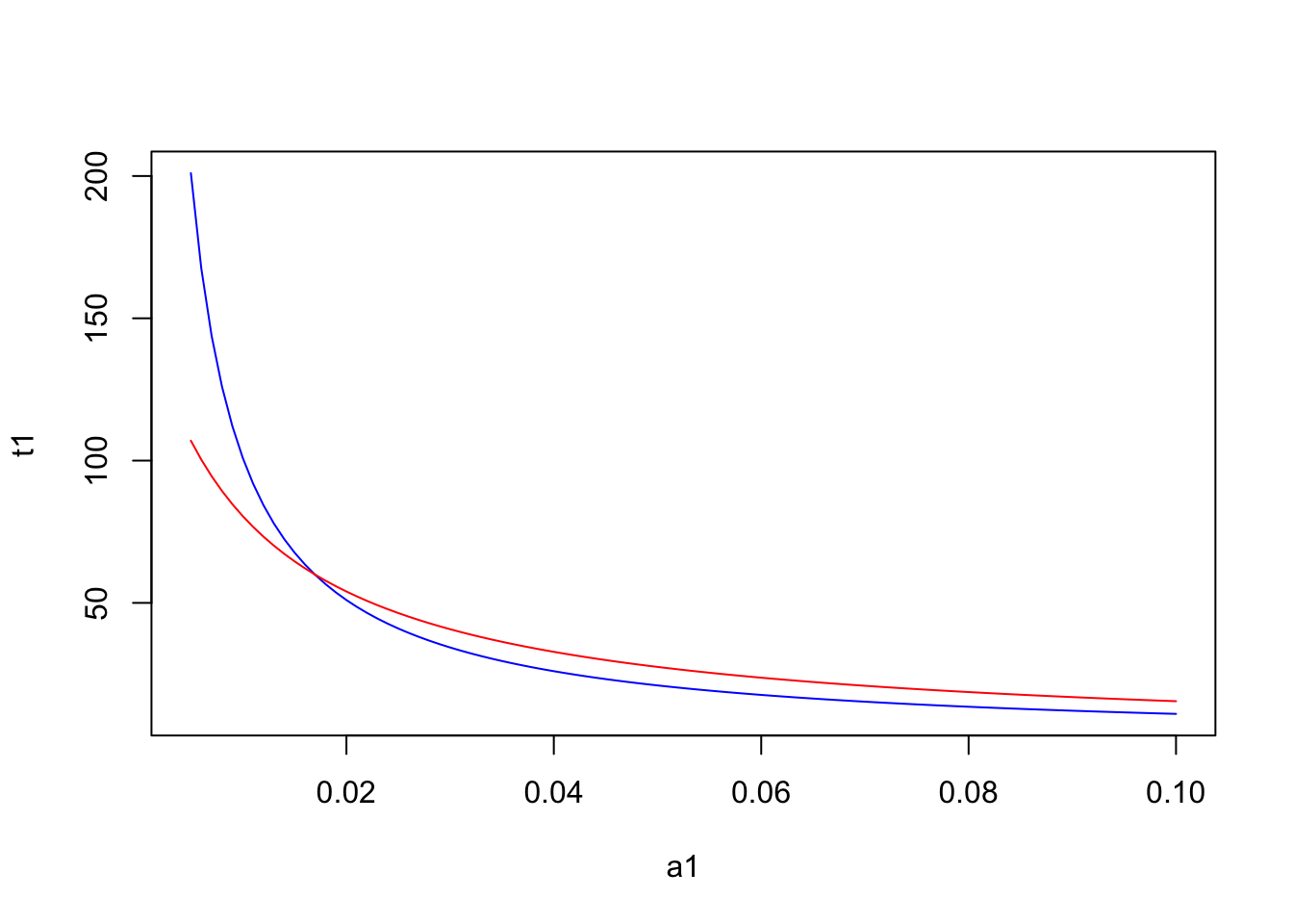 It is easy to demonstrate that Strategy 2 is always worse than Strategy 3, independently of the abundances of the two types of prey. This happens because Strategy 3 always implies a longer waiting time than the two other specialized strategies (i.e. one has to wait less time to find any item of an prey than items of a given prey time, \(1/(a_1+a_2)<1/a_2\)) and the handling time of strategy 3 can never be higher than the handling time of strategy 2 (it’s always a value betwen \(h_1\) and \(h_2\)). So we can exclude Strategy 2 from our analysis. The choice is then between Strategy 1, just taking items of the preferred prey item, and 3, taking items of both types of prey. Let’s assess this two strategies with a little bit of help from R. We start by assuming that the handling time of prey type 1 is 1 second while prey type 2 takes 60 seconds. Let’s also assume that the abundance of prey type 2 is 0.05 individuals per second, i.e. one individuals needs to wait in average 20 seconds to find prey type 2.